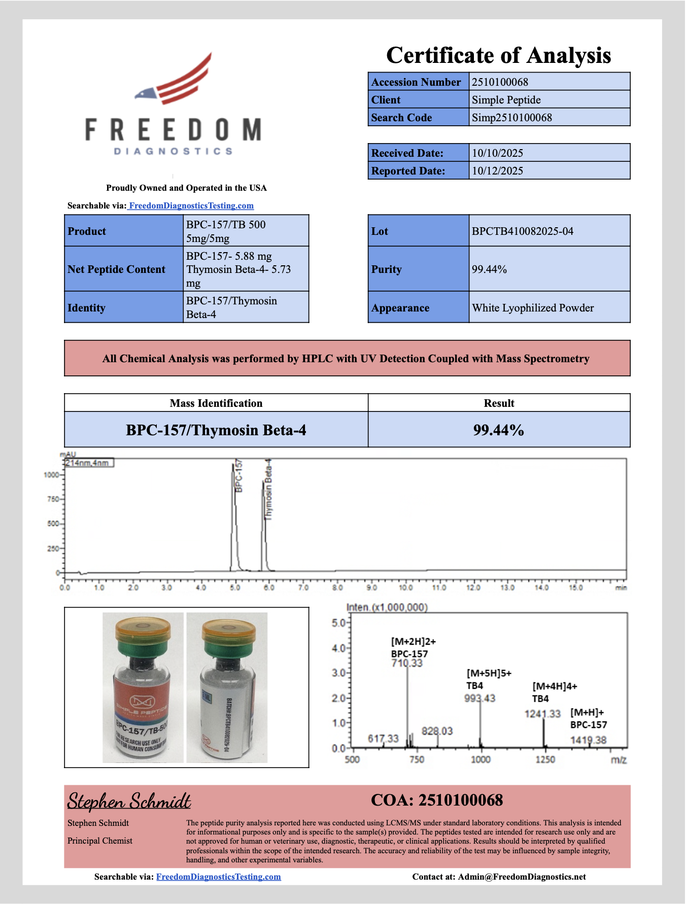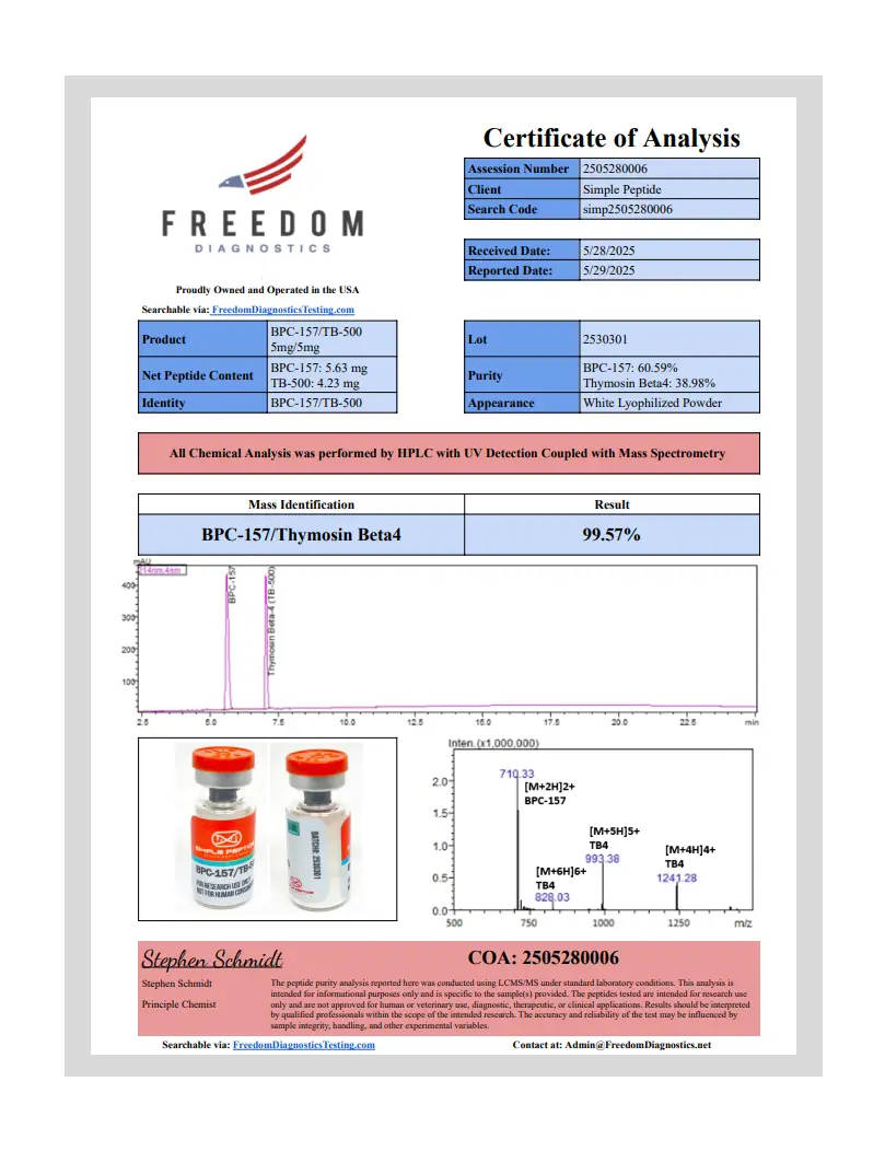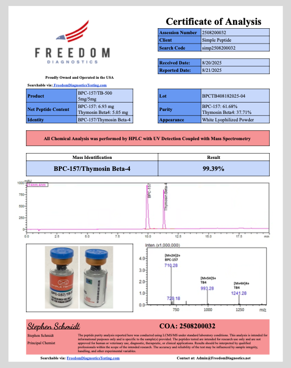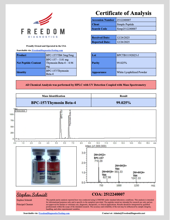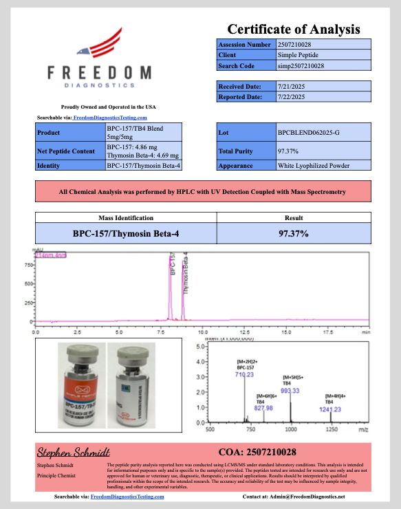 BPC-157/TB-500 Blend is provided strictly for research use only. This product is not intended for human or animal use, clinical purposes, diagnostic work, or consumption. Qualified professionals must conduct all research in proper laboratory environments and in compliance with applicable regulations and guidelines.