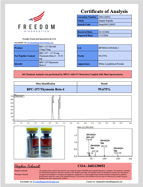 BPC-157/TB-500 Blend is a research peptide combination supplied for controlled laboratory investigation. Researchers study the BPC-157/TB-500 Blend in structured research focused on peptide interaction, sequence behavior, and signaling activity within experimental models. This defined peptide blend allows laboratories to conduct repeatable studies under stable and standardized research conditions.