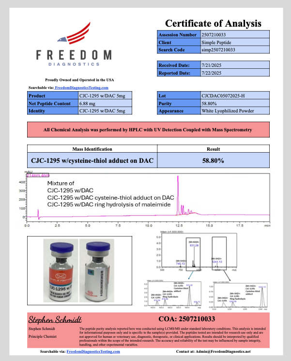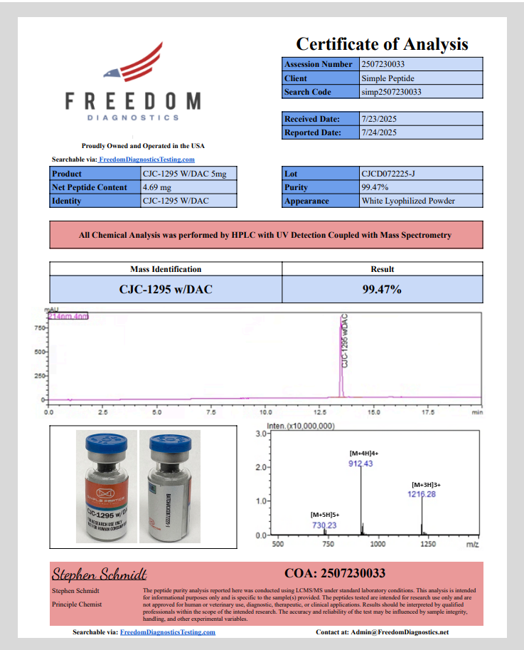 CJC-1295 w/ DAC 5MG is intended strictly for scientific research use and is not for human or veterinary applications. Each batch meets pharmaceutical-grade quality standards to support reliable laboratory research.