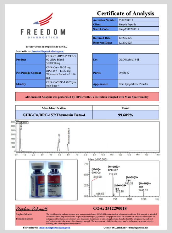 GHK-Cu / BPC-157 / TB-500 GLOW Blend is provided strictly for research use only. This product is not intended for human or animal use, clinical applications, diagnostic procedures, or consumption of any kind. Qualified professionals must conduct all research in appropriate laboratory environments and in compliance with applicable regulations and guidelines.
