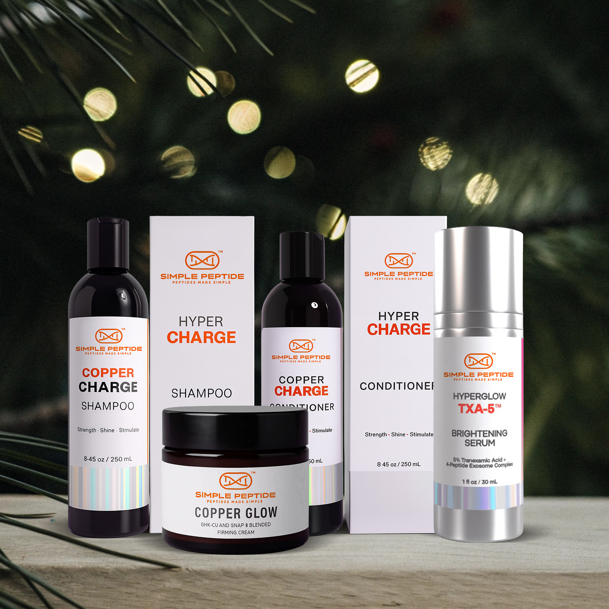 The Glow & Shine Beauty Bundle is a set of four cosmetic formulas that work together as one easy routine. Each product uses a mix of peptides, copper ingredients, plant extracts, and conditioning elements. These blends help support smoother texture and balanced cosmetic performance across each step of the routine.