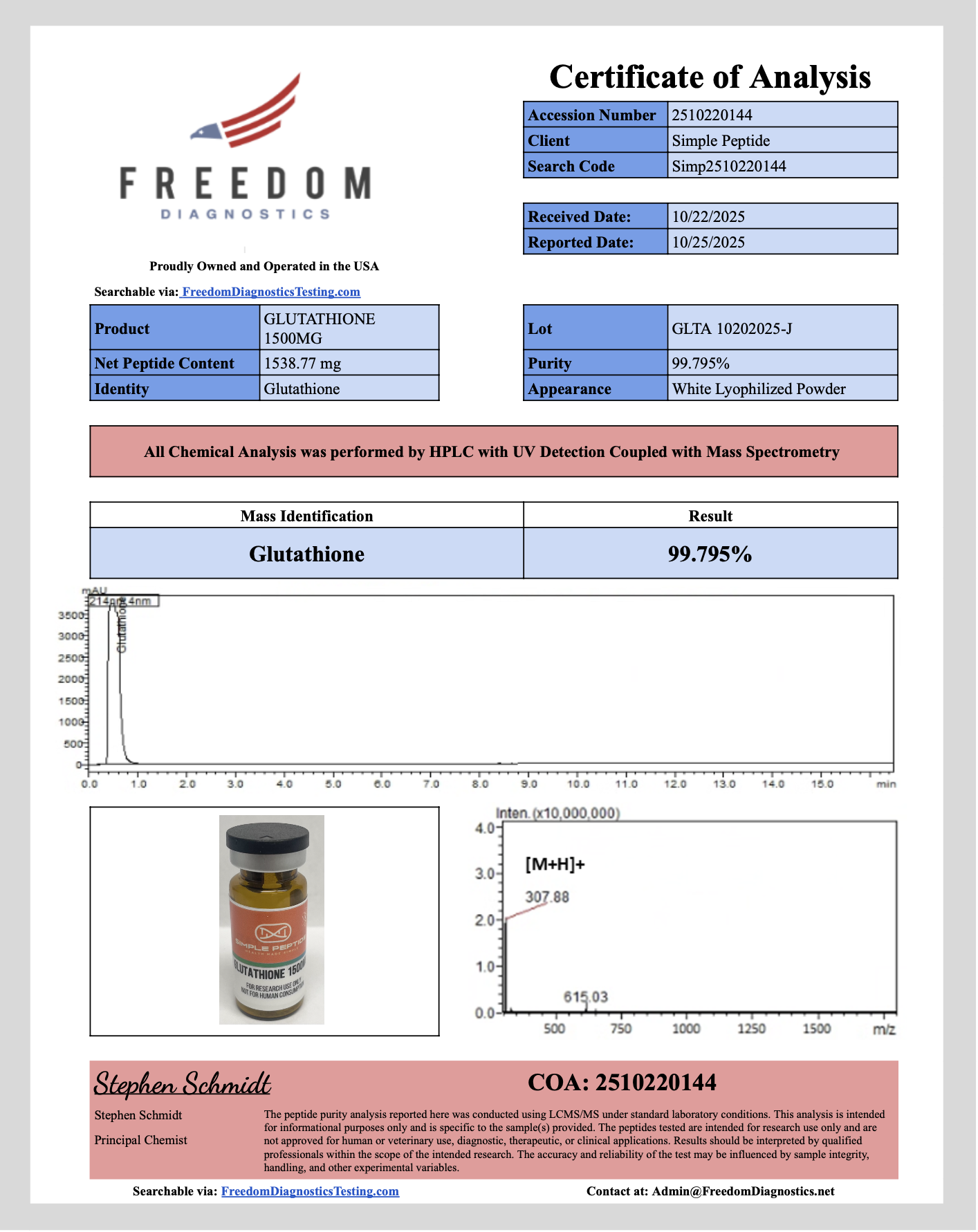 Glutathione 1500MG is a research compound supplied for controlled laboratory investigation. Researchers study this antioxidant as part of structured research focused on cellular level processes and molecular interactions within experimental models. Cells naturally produce glutathione from three amino acids: glutamine, glycine, and cysteine. This product provides laboratories with a consistent material for repeatable research under standardized conditions.