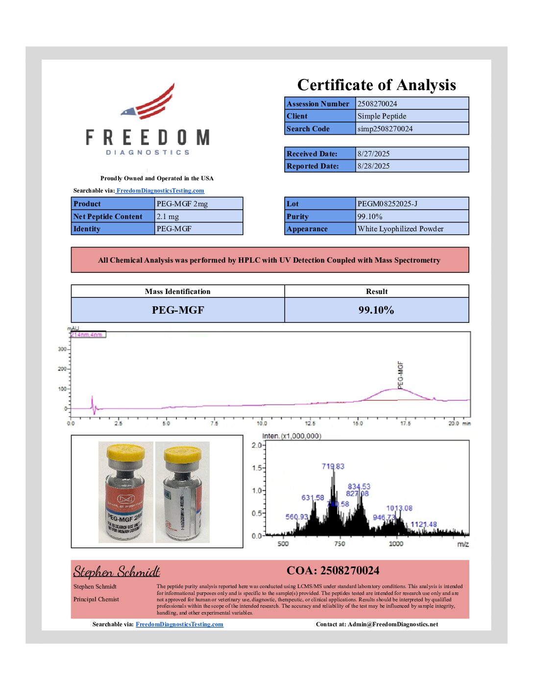 PEG-MGF is a synthetic research peptide supplied for controlled laboratory investigation. Researchers study this peptide in structured research focused on peptide signaling, molecular interaction behavior, and sequence related activity within experimental models. The pegylated structure helps support stability during laboratory handling and study design.
