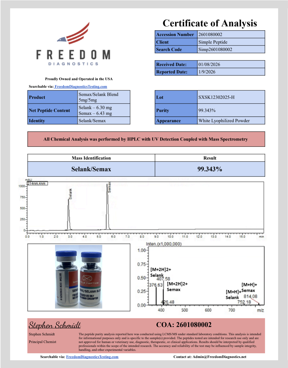 Semax/Selank Blend is a precisely formulated peptide combination developed for controlled laboratory research and evaluation. This formulation combines two well documented peptide sequences that researchers frequently reference in signaling and peptide interaction studies. By bringing Semax and Selank together in one blend, researchers can study combined peptide behavior while keeping preparation methods consistent.