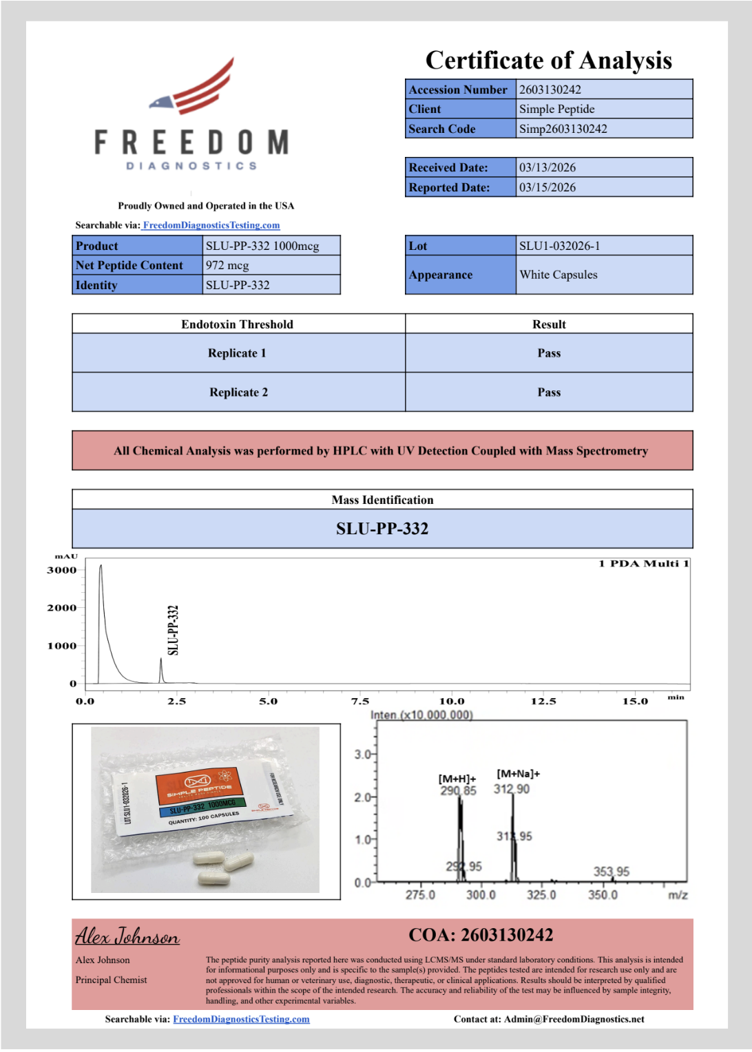 Each batch of SLU-PP-332 Capsules meets pharmaceutical-grade quality standards to support consistency and reliability in research supply. Independent testing and batch documentation allow researchers to review material specifications prior to use. Each shipment includes a Certificate of Analysis that supports batch verification and material transparency.